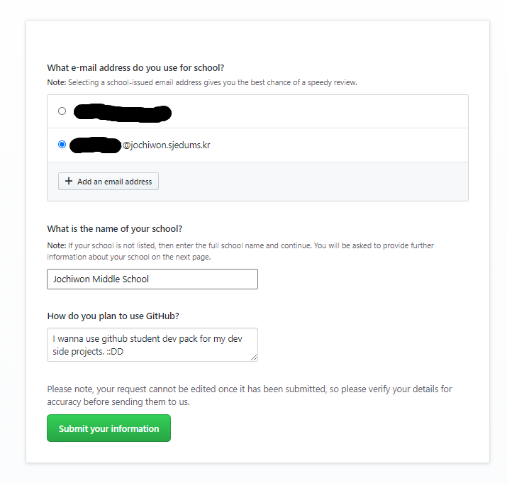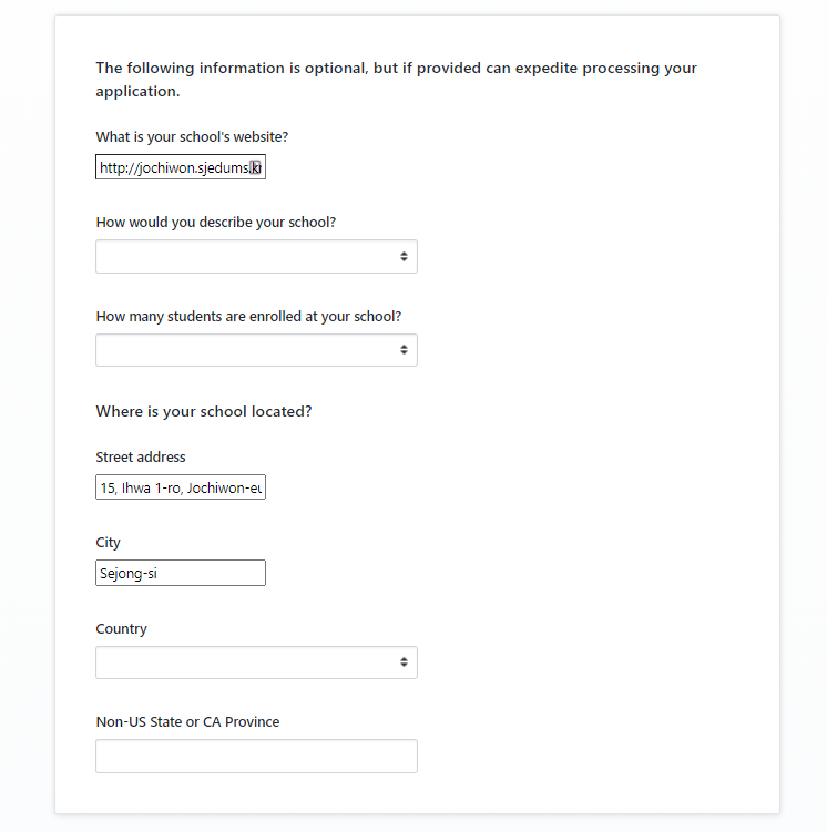 다시 email 선택 창으로 돌아와서, 학교 이메일을 선택하고 학교 이름과 간단한 정보를 기입합니다.